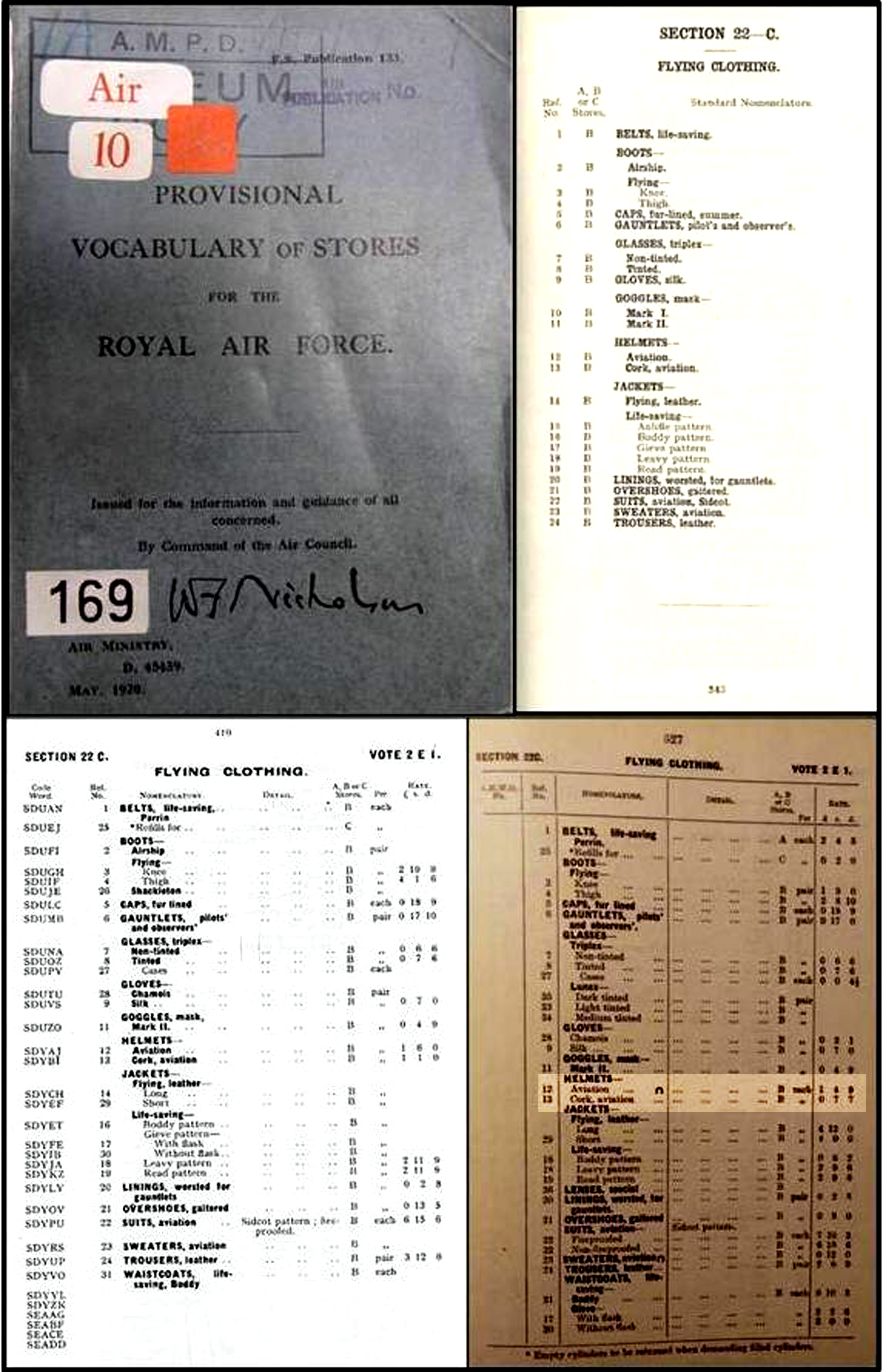 Figure 2. Top: Although a unified RAF Nomenclature had been worked on since late 1917, this is thought to be the first and only published edition of the ‘Provisional Vocabulary of Stores for the Royal Air Force’, document ‘F.S.133’, (May 1920). Cover and page 343 – the 22-C Section, ‘Flying Clothing’. Here the list is alphabetically ordered in clothing type, with reference numbering actually in sequence. This is possibly the list as it appeared when compiled at the setting-up of the RAF in 1918. The F.S. appellation stands for ‘Field Service’; a British Army series of publications, here apparently a vestige from RFC days. It has received a post printing ‘Air Publication No.’ ink stamp to bring it in line with other RAF/Air Ministry publications. It is clear that there was a distinction between ‘Caps’ and ‘Helmets’; the former soft, the latter hard. 22C/5 ‘Caps, fur-lined’ are here labeled as ‘summer’. Under ‘Helmets’ are listed two types; 22C/12 ‘Aviation’ and 22C/13 ‘Cork, aviation’. Bottom Left: page 410 of Air Publication 809 ‘Priced Vocabulary of Royal Air Force Equipment and Meteorological Stores’, first edition 1921. It uses the Nomenclature set out in F.S.133. It was amended and up-dated numerous times until A.P. 1068 took over in October 1924. It is still arranged in clothing type with Ref. Nos now getting out of sequence, as subsequent items have to be fitted into the Nomenclature’s clothing type framework. Right: The first edition of ‘Air Publication 1068; Priced Vocabulary of Royal Air Force Equipment’, giving prices for equipment replacement from October 1924 to November 1927, note 22C/12 was always substantially more expensive than both 22C/5 and 22C/13. The ‘n’ that now appears after 22c/12 ‘Helmets—Aviation’ (a name that had been on RFC lists since at least 1914) indicates ‘obsolescent and that no further purchases will be made…should be exhausted by issuing in preference to stocks of a more improved pattern…’
