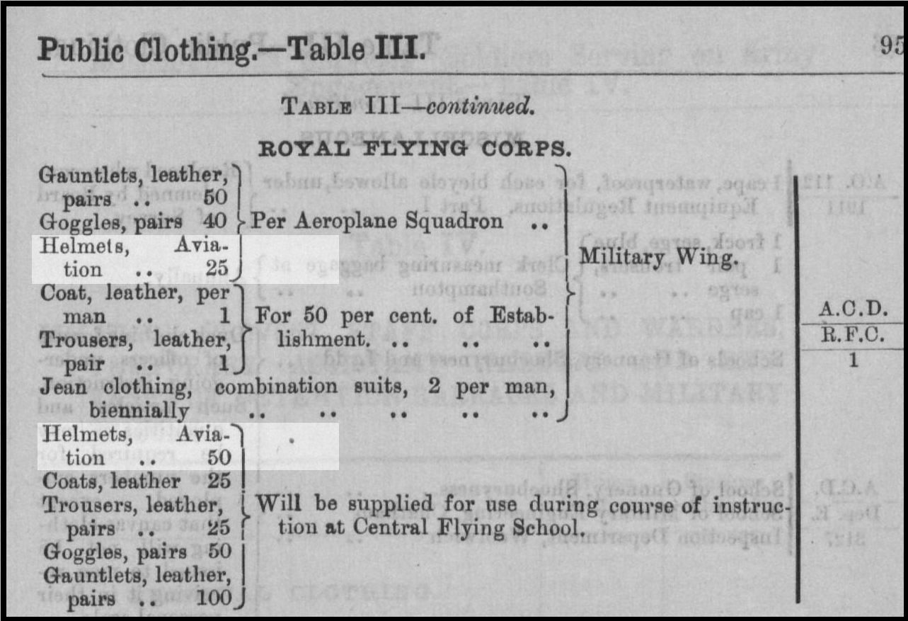 Figure 3. The earliest available list of RFC clothing, 1914 – ‘Regulations – Clothing of the Army’, the Royal Flying Corps section (in Table III). The ‘Helmet, Aviation’ is the only headwear mentioned, with 25 issued ‘Per Aeroplane Squadron’ and 50 supplied to the Central Flying School. It would appear that even at this early date it was seen as primarily a training helmet, and would imply it was a ‘Protective’ helmet. At this time only the ‘Roold’ and ‘Improved “Warren” Safety Helmet’ had been adopted as War Office ‘Sealed Patterns’ (Cormack & Cormack, 2001) and probably both were encompassed by the term ‘Helmets, Aviation’ in this 1914 list, as they both did the same job.