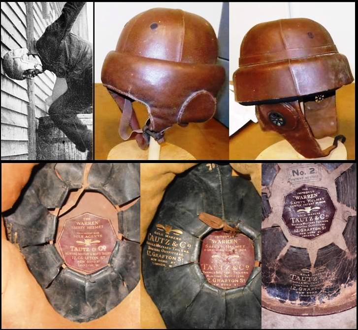 It mainly involved making the helmet oval shaped in plan-view rather than round, adjusting the sprung steel strip lengths to accord to the oval form and improving the internal padding and straps. Because the helmet type was synonymous with the name ‘Warren’ it continued to carry that name though-out its lifetime. Warren’s original design and the first ‘improvement’ by Curtis, were both well padded inside and out with horsehair under a leather or oilcloth cover, internally this was to protect the head from the metal frame. In December 1916, however, Curtis again submitted to the Patent Office further ‘Improvements to Helmets for Aviators & the like’, this time making the outer surface much neater, removing the outer padding, apart from a 2-3 inch ring of foam rubber around the brim, all covered by tight leather or oilcloth over the cork. This made it almost indistinguishable from the ‘Roold’ type at a distance, but it still kept Warren’s internal steel sprung dome. This patent was granted August 1917, it was called the No. 2 Patent, ‘Improved “Warren” Safety Helmet’. The last dated commercial advertisement found showing a ‘Warren’ helmet is a general Tautz & Co one from 18 October 1918.