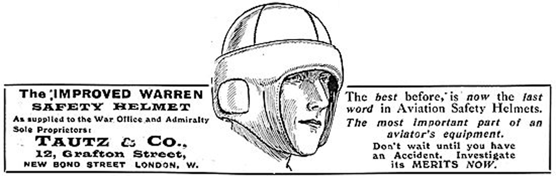 It can be seen that later Warren Safety Helmets can have a confusing amount of labeling inside them. The reason for this complexity is that in 1912 Mr. W.T. Warren invented a safety helmet, he used a ‘Roold’ (a 1910 French design) like padded cork shell, but attached to the inside of the cork were sprung steel strips forming a dome attached to a small disc inside the crown and a round metal band at the brim (see Fig. 8, left). At this time there was mounting concern about the shocking accident and fatality rates due to unregulated flying and internationally moves were being made to improve its safety (e.g. ‘To Make Flying Safe’, Literary Digest, Oct. 5, 1912). Warren is reported to have patented the idea early that year, although the patent number and details are elusive. In 1912 Warren’s design was marketed by ‘Aeros, Ltd’ (also trading as ‘Aeronautical Accessories’), 39 St. James Street, Piccadilly, London, who were the sole agent for ‘The Warren Patent Safety Helmet’. By mid-1913, however, it appears ‘W. T. Warren, Ferndale, Mount Rd., Hendon’, was selling the helmet himself. But then by July 1914 it appears Warren had sold the rights of the patent to Tautz & Co; a Naval & Military tailor in London, who then became sole agents. Initially they sold the standard ‘Warren Patent Safety Helmet’, but by December 1914 they were advertising the ‘Improved “Warren” Safety Helmet’ a redesign lodged by the Proprietor Mr. C. H. Curtis of the ‘tailor and breeches maker’ Tautz & Co., this was patented as ‘Improvements in Helmets for Aviators and the like’ No. 19109, August, 1914.