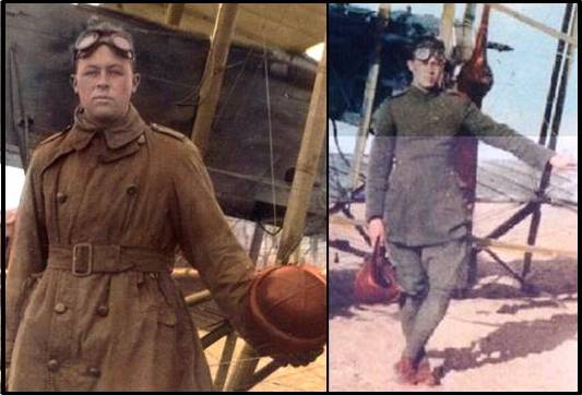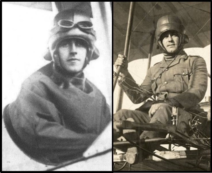 Figure 10. Left: Well known portrait of Henry Petre at Australia’s Point Cooke, Central Flying School in mid-1914. He had been brought to Australia two years earlier to help establish an Australian Flying Corps and is probably wearing an original pre-war/pre-Tautz ‘Warren Patent Safety Helmet’. Right: one of the school’s pupils Lt. Roy Trout, in 1916. His precarious sitting position illustrates the need for crash helmets in the early days.
