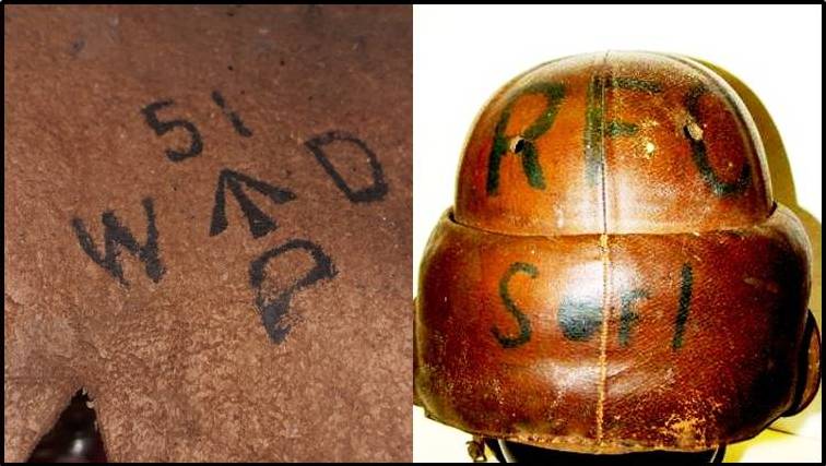 Figure 11. At left, a standard WD property mark in the helmet shown in Fig. 1, these are commonly found under the leather headband of Warren helmets. At right a less standard RFC ‘property mark’; (‘S of I’ = School of Instruction? Reading?).