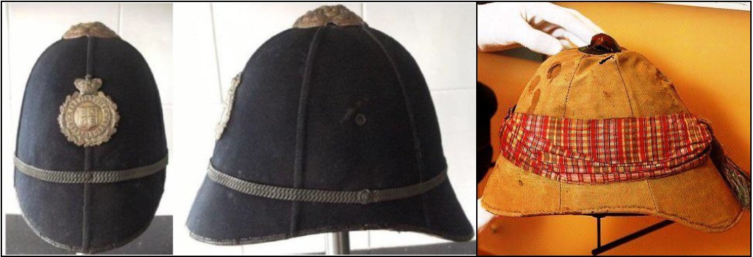 Figure 10. An ‘Alternative’ post 1875 Custodian police helmet style, (Ross Mather, WWW.british-police-history.uk). Following the way sun helmets were evolving, i.e. losing the air pipe and gaining steeply dipping brims and being constructed of a lightweight cork shell, with cloth paneled covering. This example has a low finial, the ‘rose top’. Versions of this simple bell like pattern have coexisted with the cockscomb models since the mid-1870s. At right, possibly the most famous Colonial Pattern Helmet of the early 1870s, this was Henry Morton Stanley’s helmet during his search for Livingstone. As can be seen the ‘Alternative’ Custodian seems to be a direct copy of the style.