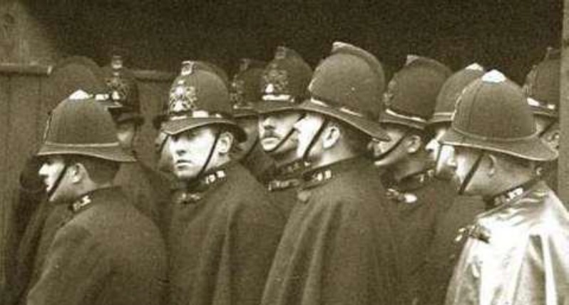 Figure 11. “What’s going on ‘ere then?” At the ‘Sydney Street Siege’ (1911) a mixture of the coxcomb style on City of London Police and rose tops on Metropolitan Police. (Note that by this time the ‘Wolseley’ style flat, extended rear brim is standard).