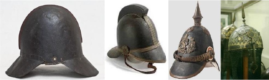 Figure 12. Pickelhaube origins. Left, typical helmet construction for at least 2 thousand years, formed of three or more sheets of tough material; dome plus front and rear visor. Center Left, typical 17-18th century military leather helmet, Center Right, A pickelhaube (1842), basically a traditional design with the large spike the only unusual feature; by 1860 the height of the dome had been reduced by 8cm. Right, The spike feature was copied by early Victorian era Imperial Russia, from ancient Eastern helmets excavated at archeological sites. These were versions of Persian Kulah Khud helmets, which had also influenced Ottoman designs.