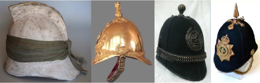 Figure 13. The Indo-British family of light-weight ‘service’ Helmets and the dragoon helmet. Left, a lightweight ventilated Ellwood ‘Air Chamber’ sun helmet, unofficially called the ‘Air Pipe’, patented in 1851, probably the inspiration for Christys’ when they developed the first Custodian pattern 1863. Left Center, a British dragoon helmet shape in existence from at least 1842 (although this is an 1847 model), probably inspired the ornamentation on the Christys’ alternative style ‘bell’ shaped Custodian introduced around 1875. Center Right, an example of Christys’ 1875 alternative bell shaped Custodian police helmet. The company themselves have said it was based on the Home Service Helmet; Right, the Home Service Helmet, officially adopted in 1878, but versions had been unofficially in use and trialed for many years, perhaps explaining the miss-match in design/adoption dates stated for the ‘Custodian’ and ‘Home Service Helmet’. Their appearance, however, can probably be seen as coeval, with the police simply being offered the new military pattern as an alternative to the coxcomb.