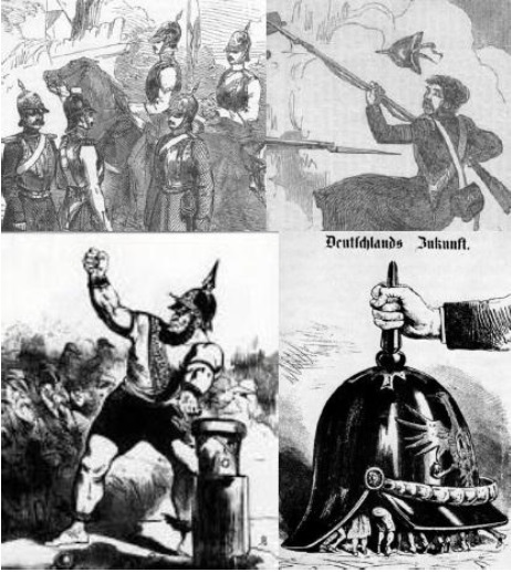 Figure 14. The patriotic case against the pickelhaube being the inspiration. Top two images, it was an enemy helmet, the pickelhaube was actually a Russian helmet, copied by the Prussians. During the Crimean War 1853-1856, which had been covered with great patriotic fervour by the British press, the Russians were the enemy and the helmet was synonymous with them. Bottom two, after the Prussian-Danish war 1864, and especially after the Franco-Prussian war, 1870-71, the pickelhaube became a symbol of the ‘rapacious, brutish Prussians/Germans’ as they increasingly became a rival power to Victoria’s Britain and other European nations.