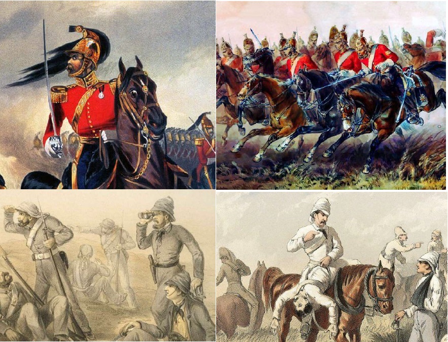 Figure 15. The Victorian police, and Christys, had plenty of local inspiration for a new hat. Here are artist’s impressions of the possible European and Indian contenders. Top left, Inniskilling Dragoons, 1846, wearing 1843-1847 pattern coxcomb helmets, by Ackermann. Top right, ‘Charge of the Heavy Brigade’, wearing 1847 pattern ‘spiked’ helmets, plumes removed; 1854, by M.A. Hayes. Bottom left, ‘British Troops Man Outlying Picket, Siege of Delhi’; 1857, by Clifford Henry Mecham. Bottom right, Indian Mutiny, Lucknow ‘The Search for Wounded’ 1857, after G.F. Atkinson.