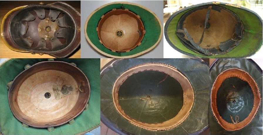 Figure 16. Post 1875 liners compared. Top left, Inside a standard pickelhaube, all heavy plain leather (officer’s liners were sometimes more refined). Top center, a typical Colonial Pattern sun helmet; leather headband, with spacers for air circulation and a spoked apical vent. Top right, 1870s bell shaped Custodian police helmet, leather headband, with grommeted eyelets in the side of the dome and apical vent. Bottom left, it is interesting to note that the Christys’ Colonial Pattern helmet (an early type?) only had spacers at the sides, similarly these two examples of Christys’ Custodian helmets (see also the coxcomb version fig. 8) have toothed cork strips as spacers; again only at the sides.