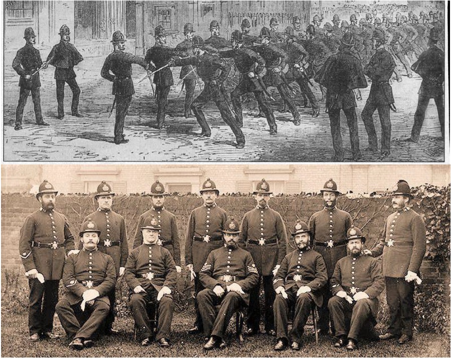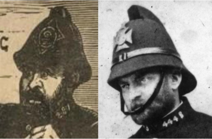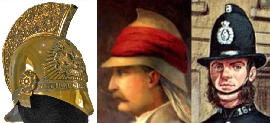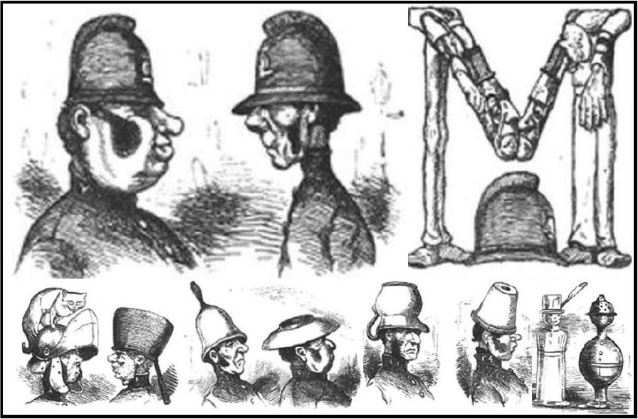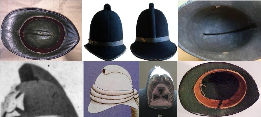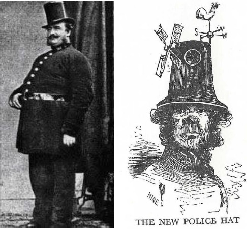 - https://www.jack-the-ripper-tour.com/generalnews/new-police-hats/ a whimsical look at the early police helmet.