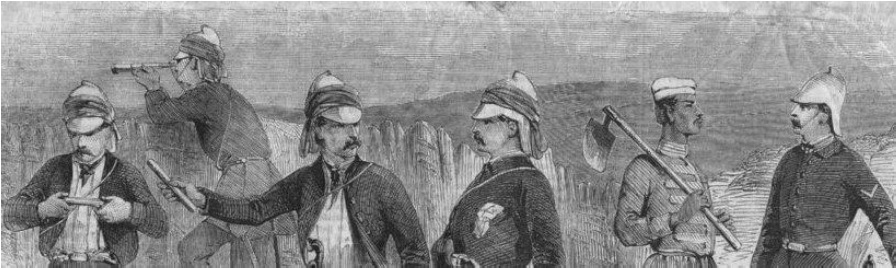 Figure 3. A light weight, well ventilated and distinctive model was already being produced in London for the Indian market, Ellwood’s ‘Air Chamber’ sun helmet, needing only a colour change? ‘Engineer officers in battery before Delhi’, 1857. Versions of this image and similar appered in many publications and best selling books about the Indian Mutany in the late 1850s and early 1860s. So whilst the Custodian helmet was being designed, this model had a high profile.