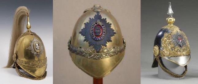 Figure 9. Seen here are distinctive 1847 ‘Albert Pattern’ helmets and the less ornate 1871 pattern. During the mid 19th century helmets like these were prominent in the British public’s mind due to ceremonial parades and patriotic imagery of Calvary charges etc. In the mid 1870s these probably provided the inspiration for the ornamentation on the new Army Home Service Helmet and its sibling – the alternative bell shaped Custodian style for the police. The spike is correctly called a plume holder.