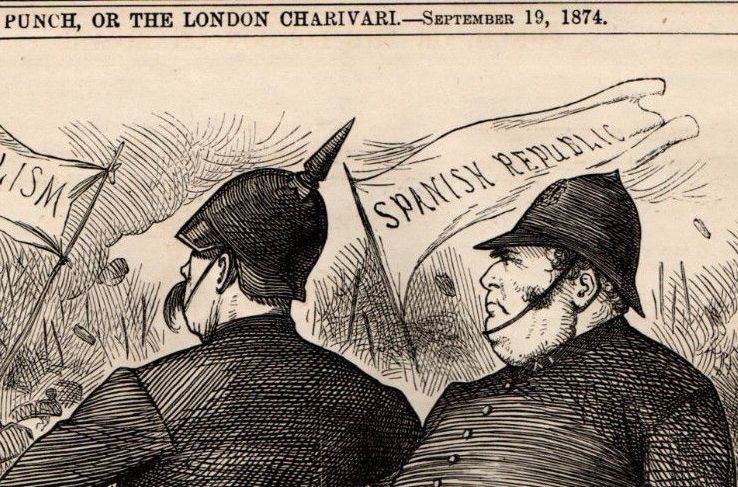 Figure 18. 1874 a generic British Bobby gives sage advice on international relations to Chancellor Otto von Bismarck. Two completely different helmets, materially, design wise and by contemporary perceived character and role. The Bobby wears an early ‘alternative’ Custodian.