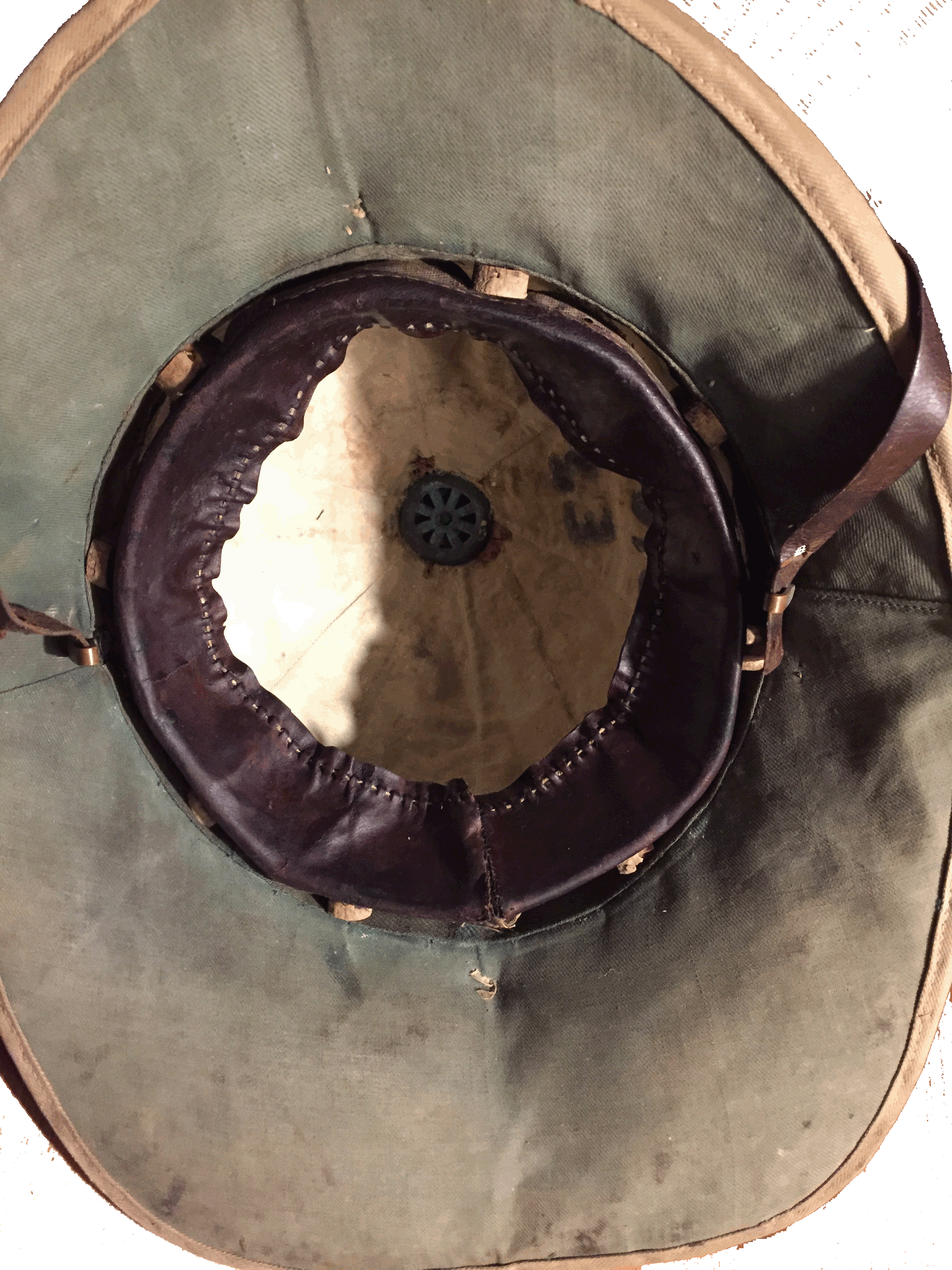 Finally, three details remained. Firstly, the ventilation cap was flattened. Interesting how that could have happened without crashing the cork shell, but probably happened when the cap was not on the helmet. Anyway, it was carefully bent back into its original shape. Secondly was the original chin strap, amazingly, it was still there, though in two pieces. Again, leather conditioner smoothed it, and bookbinder´s glue joined the two pieces. Thirdly, there were some spots of wax on the upper side. Anyway, an old housewife´s trick was applied. Put a sheet of blotting paper on the wax and suck the wax into it by carefully flattening the paper with a hot flattening iron. Perfect.