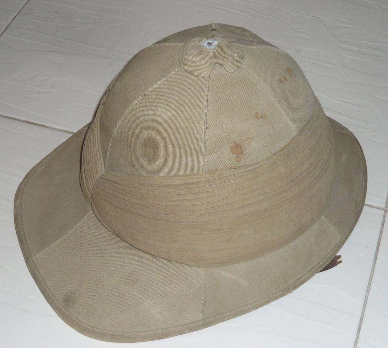 But on the market, many items altered in one way or another, can be seen. These alterations are often described as “field repairs”. Which can make sense. Cork or pith helmets were comparatively delicate things. Most likely even, they were more or less one-way articles – probably thrown away when replacement were easily at hand. Only if not, they might have been repaired. Like this one – perfect on the first and even second view – but with details, that tell differently. These may be of interest to the readers of this website.